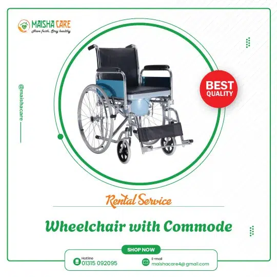 Rent a high-quality wheelchair with commode in Dhaka from Maisha Care at just 400 BDT per day. Our wheelchair ensures comfort, safety, and easy mobility for patients, elderly, or those recovering at home. Perfect for home care, hospitals, or short-term medical needs. Quick delivery and reliable service in Dhaka. Book your wheelchair with commode today!
